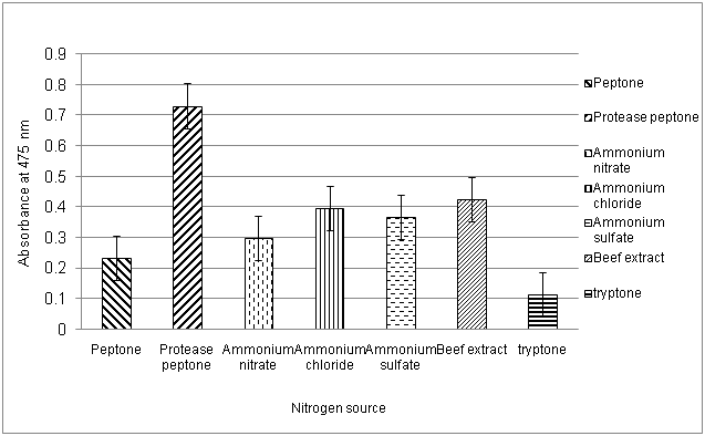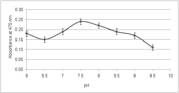 The effect of various physical and chemical parameters on pigment production was evaluated by varying one parameter at a time and keeping the other parameters constant.The one giving best result was used in further experiments. At the end of each experiment, a pigment was extracted and its absorbance was measured at its λmax.