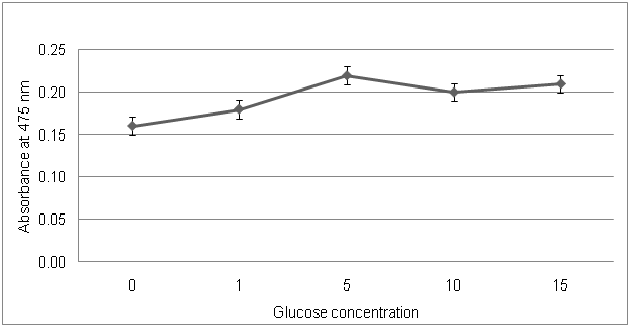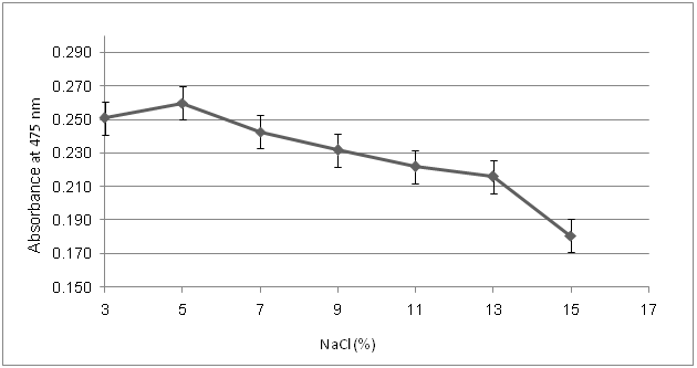 Different parameters influencing the pigment production were studied individually by varying one parameter at a time. Taking one parameter at a time represented an efficient way to optimise production of microbial metabolites and/or biological processes [16,17].We observed maximum pigment production at 10°C (0.29±0.01) (fig. 1a) and pH 7.5 (0.23±0.005) (fig. 1b). It decreased with increase in temperature. The response of microorganism to low temperature in terms of increasing proportion of unsaturated fatty acids is well documented [18]. It helps in increasing membrane fluidity. Medicharla et al. [19]have suggested arole of carotenoid in maintaining rigidity of membrane at low temperature. Kocuria carniphila MY and Kocuria polaris MO were also found to produce carotenoid optimally at 10°C and at neutral pH [9]. As shown in fig. 1c, pigment absorption was highest at 5% glucose (0.22±0.005). Kocuria sp. K70 showed better pigment production at 1% lactose while for Arthrobacter sp., Serratia marcescens, Brevibacterium marisglucose proved to be the better source [20]. We have used different organic and inorganic nitrogen compounds to examine their effect and among all, protease peptone (0.73±0.0005)was found to be the best (fig. 1d). Optimal effect of organic nitrogen on pigment production had been also observed by Kim and Park [21] in Kocuria sp.SmilarlyEl-Sharouny [22] and Subhasree et al. [23]have reported higher pigment production in presence of peptone and yeast extract from Kocuria carniphilaMY and Kocuria Polaris MO, respectively. Kocuria sp. BRI36 (this work) is a halotolerant isolate from cold region and can grow upto 15% w/v NaClconcentration [10].However, increase in NaCl concentration above 5% decreased the pigment yield (fig. 1e). We have come across a few studies which focus on biotechnological production of pigments at NaCl concentrations of ≥ 15% w/v NaCl. For example, pigment production by photosynthetic halophiles at saturated NaCl (35% w/v NaCl), conferring diverse ecological advantages to the halophile which helps them to dominate their habitat [24, 25].Another species of Kocuria sp. K70, have exhibited pigment production at 2% NaCl [21]. Similarly,Pseudomonas sp. isolated from marine environment had also displayed production at 2% w/v NaCl [26].NaCl both reduces water activity and osmotic stress in microbial cells;the cellular stress imposed triggers increase in various types of metabolites [27, 28]. The reduction in water activity is pertinent to the current study as this is the parameter which stimulates anincrease in secondary metabolites.