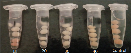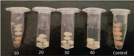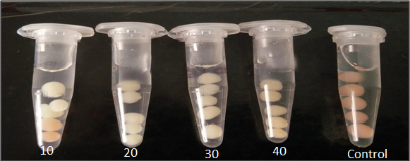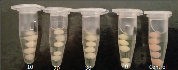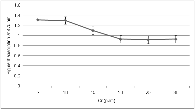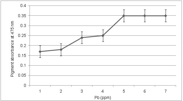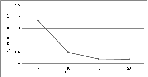 Kocuria sp. BRI 36 exhibits very high tolerance to heavy metals viz. lead, cadmium, chromium and nickel [12]. Immobilized cells of BRI 36 were used to determine the effect of metals on pigment colour.Immobilization was achieved using 2.5% sodium alginate and 50 × 10-3 mole calcium chloride[11].The beads formed were exposed to 10-40 ppm concentration of each metal for 24 h.