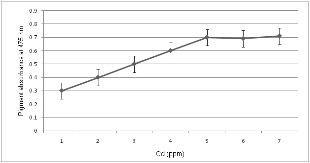 To check the effect of heavy metals on pigment production,BRI 36 was cultivated in a previously standardized medium supplemented with different concentrations (1 to 5ppm) of Pb2+and Cd 2+whereas it was 5 to15 ppm for Ni2+and Cr3+. At the end of incubation, cells were separated by centrifugation at 8000 rpm for 15min, thepigment was extracted and its absorbance was measured at λmax.