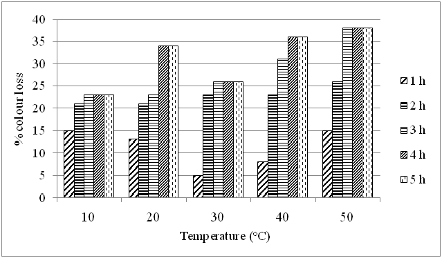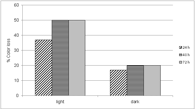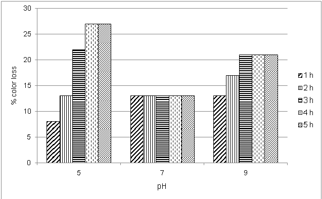 The stability of crude pigment was determined in terms of its absorbance at λmax.The effect of various conditions of pH (5.0, 7.0, 9.0) on stability was examined at room temperature. The pH showing maximum stability was selected to investigate effect of temperature (10 to 50°C). These conditions were further used to analyse an effect of dark and light conditions for different time intervals (24, 48, 72 h) on stability. Percent color loss was determined by using the following equation.