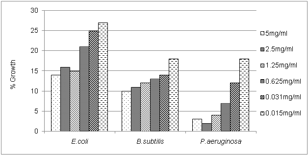 Antimicrobial activity of the crude pigment was studied against E. Coli, Pseudomonas aerugenosa and Bacillus subtilis. The activity increased with increasing concentration of pigment (0.015 to 5 mg/ml). We observed 83% growth inhibition in Pseudomonas aeruginosa and Bacillus subtilis while it was 75% in case of E. coli at 0.015 mg/ml concentration. The maximum effect was recorded in Pseudomonas aeruginosa with more than 95% inhibition at 5 mg/ml concentration (fig. 5).