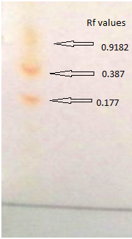 Fig.6: Thin layer chromatogram of the crude pigment,the sample was resolved using butanol:ethanol:water (9:1:1) system