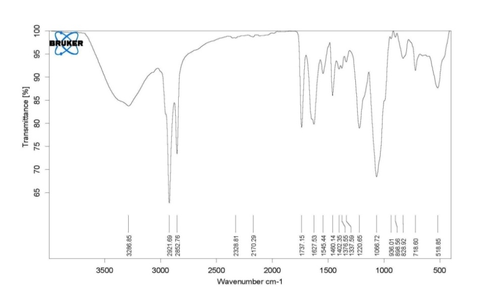 The crude pigment was found to be a mixture of three different compounds corresponding to the Rf values of 0.177, 0.387, 0.9182 (fig. 7) as observed in TLC experiments. The Rf values (0.387 and 0.9182) are in accordance to reported Rf values of carotenoid pigments [37]. Rf value of 0.177 indicates thepresence of xanthophyll which is an oxygenated derivative of carotenoid [11]. FTIR spectra of crude pigment gave the prominent peaks at 2921.69, 2852.76 and 1066.72 cm-1 as depicted in fig. 6. Other peaks were observed at 1737.15, 1627.53, 1460.14, 1220.65, 518.85 cm-1. Comparatively very less literature is available on psychrotrophic bacterial carotenoid pigment using FTIR spectroscopy. The bands at 2921.69 cm-1 are due to asymmetrical stretching vibration of aliphatic CH group while at 2852.76 cm-1 are due to asymmetrical stretching vibration of thesame group as is interpreted by Latha and Jeevaratnam [38].The peak at 1460 cm-1may be due to asymmetrical deformation vibration of CH3 groups. Bands at 1657 cm-1may be due to thepresence of theolefinic functional group. Peak at 1734.42 cm-1is due to>C1=O group probably ester. However thecomplete structure of compounds cannot be determined based on IR data. Vibrational peaks are most likely due to oxidation and/or deformation in polyene chain [39].