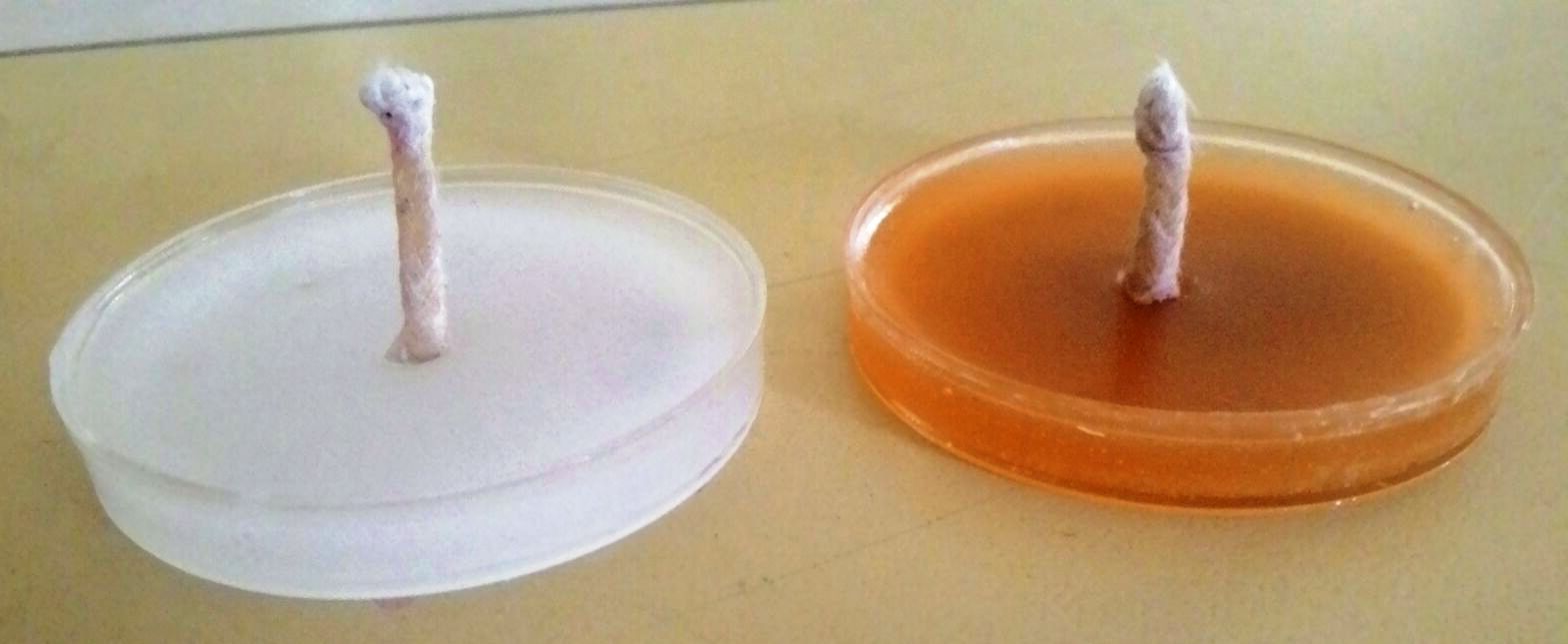 The absorbance of pigment at 475 nm at room temperature and pH 7.5 was considered 100% and colour loss was determined with respect to that. Crude pigment showed ~77% stability at 10°C at the end of 5 h, while theincrease in temperature caused aloss in stability with ~38% colour loss at 50°C after 5 h (fig. 4a). Exposure of the pigment to various pH at room temperature indicated ~90% stability at pH 7.0 (fig. 4b). Studies on theeffect of dark and light conditions on pigment stability showed ~ 80% and 50% stability respectively at the end of 72 h (fig. 4c). Similar studies were carried out by Shatila et al. [34]and they have shown 80% stability in orange colour pigment producing Exiguobacterium aurantiacum FH after exposure to light for 24 h. Thus our results indicated application potential of Kocuria sp. BRI36 pigment in textile, food, decorative articles as acolouring agent. Fig. 8 shows its use in preparation of colourful candle using paraffin wax.