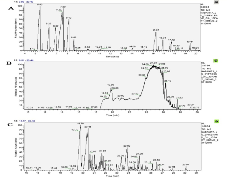 Fig. 1: GC/MS analyses of (A) curry leaf oil, (B) cypress oil and (C) spikenard oil. RT= retention time