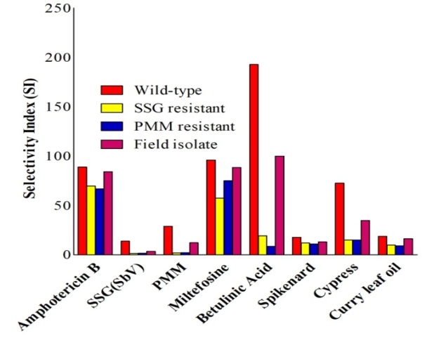 Fig. 3: Comparative study of selectivity index (SI) of amphotericin B, sodium stibogluconate (SSG), paromomycin (PMM), miltefosine, betulinic acid, spikenard, cypress, curry leaf oil