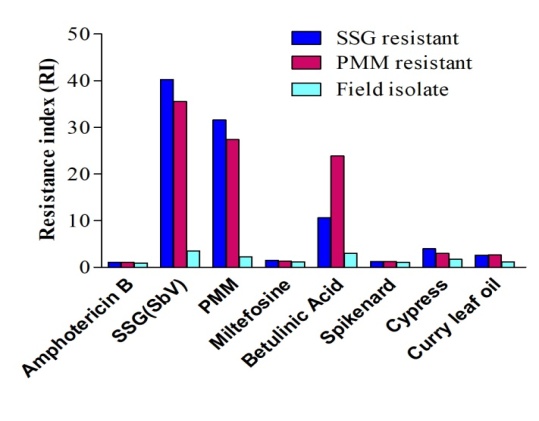 Fig. 2: Comparative study of resistance index (RI) of amphotericin B, sodium stibogluconate (SSG), paromomycin (PMM), miltefosine, betulinic acid, spikenard, cypress, curry leaf oil