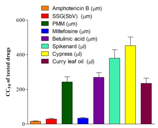 Fig. 4: 50% cellular cytotoxicity (CC50) of amphotericin B, sodium stibogluconate (SSG), paromomycin (PMM), miltefosine, betulinic acid, spikenard, cypress, curry leaf oil against isolated peritoneal macrophage cells. Data represented as mean±SD, n=4; the presented results are the average of four (4) determinations
