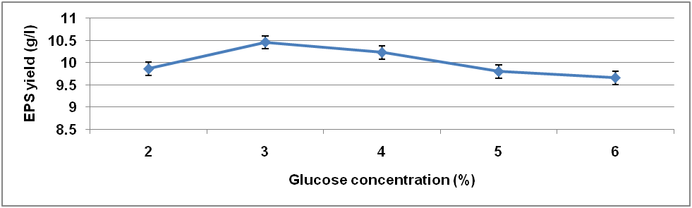Effect of different media components on the production of EPS was investigated. Effect of carbohydrate concentrationwas checked by using different glucose concentration as 3%, 4%, 5% and 6%. Maximum EPS yield of 10.5g/l was obtained at 3% glucose concentration, which decreased with increase in sugar concentration (fig.1).