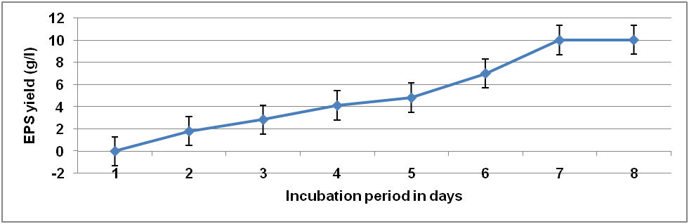As regards effect of theincubation period, it was found that EPS yield gradually increased with incubation period up to 7th day and then remained stationary (fig.2). EPS yield obtained on 7th day was 10 g/l.