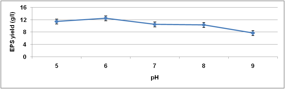 EPS yield gradually increased with increase in inoculum size. At 10% inoculum size, EPS yield was found to be 9.75 g/l (fig. 3). Effect of different pH on EPS yield was checked and maximum EPS yield was observed at pH-6 which is 12.68 g/l followed by agradual decrease with increase in pH value (fig. 4).