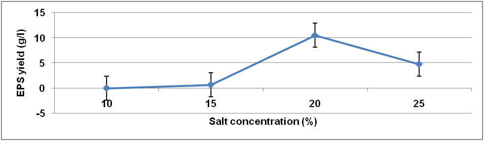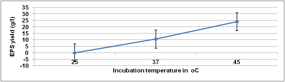 As regards effect of different salt concentrations, it was observed that maximum EPS was produced at 20% salt concentration as 10.65 g/l (Fig.5). EPS production checked at different incubation temperature indicated that at ahigher temperature, theyield of EPS is increased. At 45 °C EPS yield was observed as 23.95 g/l (fig. 6).