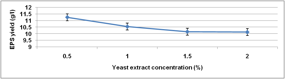 Fig.7: Optimization of yeast extract concentration showing 0.5% yeast extract as the optimum nitrogen source yielding 11.34 g/l EPS. The number of experiments was 3 and data given in mean SD and SE