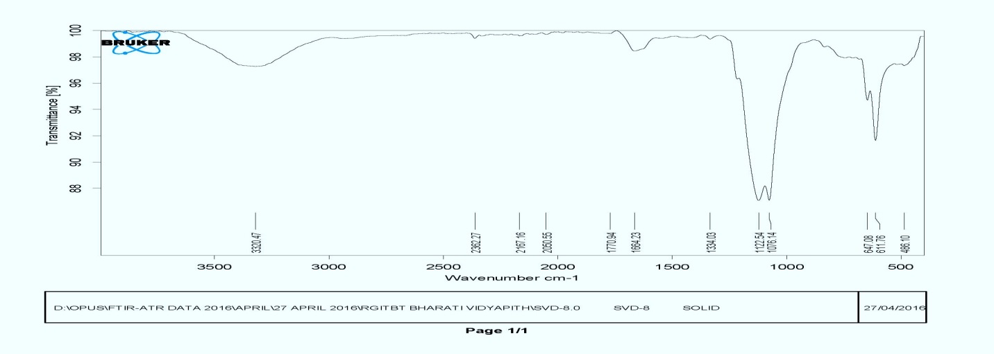 In FTIR spectra, the bands of 1770.94 cm-1 and 1664.23 cm-1 indicate thepresence of the carbonyl group. Bands of 1122.54 cm-1 and 1076.14 cm-1 are dominated by glycosidic linkages (strong C-O bonds) of the polysaccharide. The band at 3320.47 cm-1 is due to broad presence of the OH group. The–CH2 wagging is observed at band 1334.03 cm-1. The band 647.08 cm-1 is due to the out of plane bending of–OH group (fig.8).