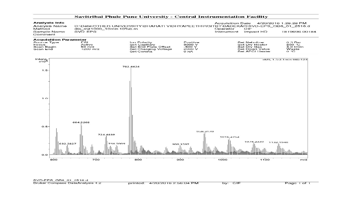Mass spectrometry suggested thepresence of an oligosaccharide. The sample showed the peak at 1132.1940 which could be because of about 6-7 monosaccharide units. There are some peaks seen with the loss of 60 units suggesting thepresence of sugar which has lost C2H4O2. Base peak is seen at 782.4424 (fig. 10).