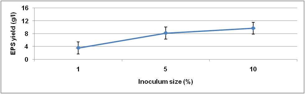 Fig.3: Optimization of inoculum size indicating 10% inoculum size as optimum with EPS yield of 9.75 g/l. The number of experiments was 3 and data given in mean SD and SE