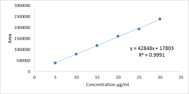 Working standard solutions were injected in the range of 10-60 μg/ml under optimized chromatographic conditions and peak areas were calculated at 249 nm. A calibration curve was plotted between peak areas against concentrations of the drug. Linear regression data as well as calibration curve were shown in fig. 5.