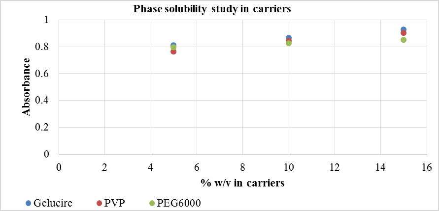 In order to determine the most suitable carrier for atazanavir sulphate, phase solubility study was carried out by adding excess of drug (30 mg) in aqueous solution (25 ml) with different carriers like PVP, PEG 6000, gelucire-44/14 at various concentration levels (5%, 10%, 15% w/v). The suspensions were continuously stirred on rotary shaker (Remi instruments Ltd) for 24 h at room temperature. The suspensions were filtered through a 0.45 µm Whatman filter paper. The filtrates were suitably diluted and analyzed for the dissolved drug by HPLC.
