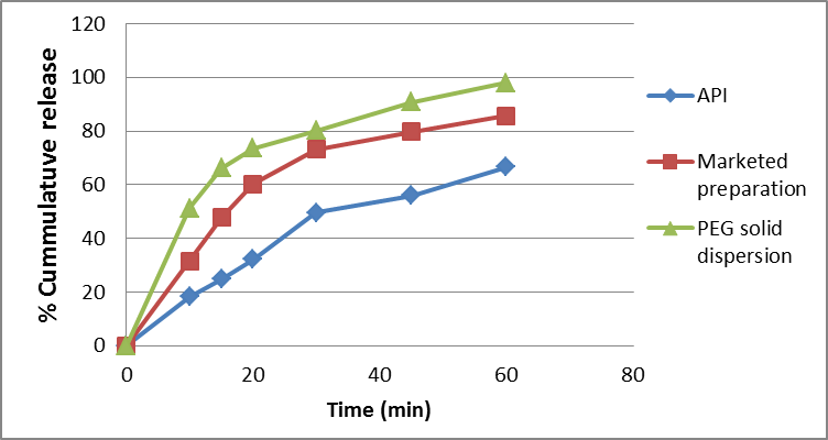 Fig. 7: Comparison of dissolution profile of API, marketed preparation, drug: carrier PEG 6000 (1:5) solid dispersion (n=3 for API, marketed preparation, drug: carrier PEG 6000 (1:5) solid dispersion)