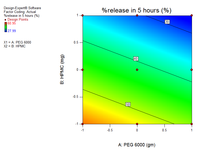 Fig. 9: Counter plot for cumulative % release at 5 h of formulations as function of PEG 6000 and HPMC
