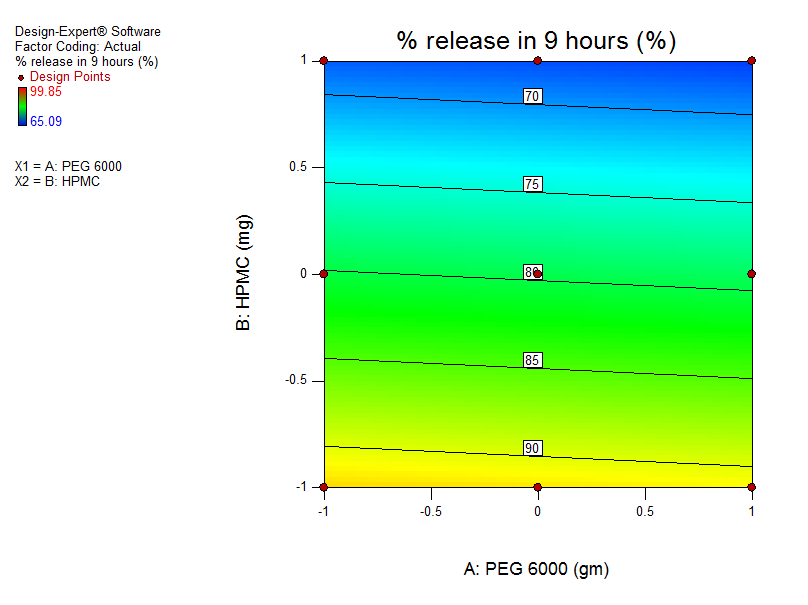 Fig. 10: Counter plot for cumulative % release at 9 h of formulations as function of PEG 6000 and HPMC
