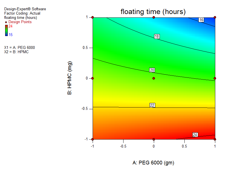 Fig. 11: Counter plot for total floating time of formulations as function of PEG 6000 and HPMC