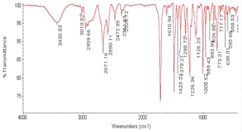 IR spectrum showed (fig. 1) characteristic broad peak at 3430.83 cm-1 ruled out the possibility of presence of an acid. IR spectrum sharp peaks characteristic at 893 cm-1 (-C=C-disubstituted olefinic), 1298 cm-1(-C-O-), 1760 cm-1 (Acetic carbonyl-C=O), 3019 cm-1 (-C=CH-), 2959 cm-1(Alkane-C-H), 1008.62 cm-1, 2361 cm-1(-C≡C-), 2328 cm-1, 1610cm-1(-C=C-Aliphatic), 1423 cm-1, 1126 cm-1(-C=O Hetro atom).