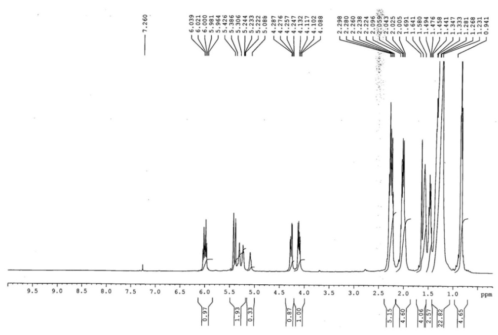 Proton NMR spectrum showed unsaturation at 6.039 ppm and peak at 5.426 ppm, 2.260 ppm due to ethylenic and methylene proton atom respectively. These are comparable with reported data of synthetic methyl ester of santalbic acid.[18] While other peak and signals at δ value 0.94 (T, 3H), 1.24 (Q, 28H), 1.44 (M, 3H), 1.64 (M, 4H), 2.0 (Q, 5H), 2.26 (Q, 6H), 4.0 (T, 1H), 4.4 (T, 1H), 5.5(T, 1H), 6.0 (M, 1H) was also seen in proton NMR (fig. 2).