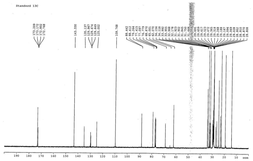 The result obtained from 13C NMR spectrum showed strong peak due ethylenic carbon atom at 143.33 ppm and 109.768 ppm. While due to E-enyne system it shows apeak at 32.968 ppm and 19.297 ppm (Methylene carbon atom) which are comparable with reported data of synthetic methyl ester of santalbic acid. Also the other peak and signals atδ value 110 (C-9, 10 S), 130 (C-7, 8 D), 173 (C-18, S), 29 (C-1 Q), 30 (C-2 T), 31.8 (C-5, 13, 12 T), 34 (C-11, 12, 4, 16, 6, 17 T), 22.8 (15, 14, 3 T) was seen (fig. 3).