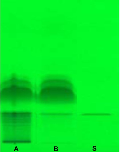 Fig.4: Photograph of HPTLC plate for (A) Crude petroleum ether extract; (B) Fraction of petroleum ether extract; (S) Standard santalbic acid, detection at 254 nm
