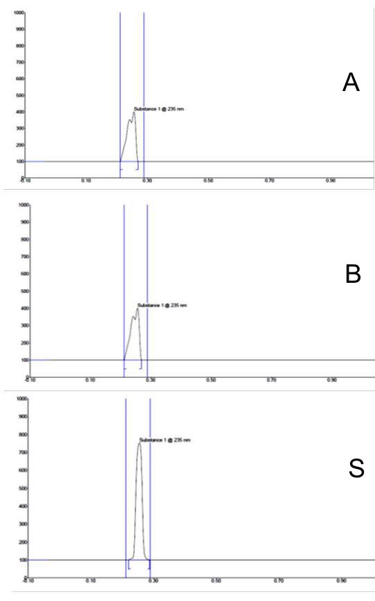 Fig.5: HPTLC chromatogram of (A)Petroleum ether extract of Santalum album seeds (B) Fraction of petroleum ether extract of Santalum album seeds (S) Standard santalbic acid at 235 nm