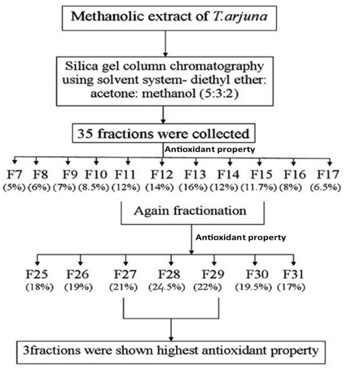 Fig. 1: The strategy for antioxidant activity guided fractionation of the total methanol extract from Terminalia arjuna (TA) bark