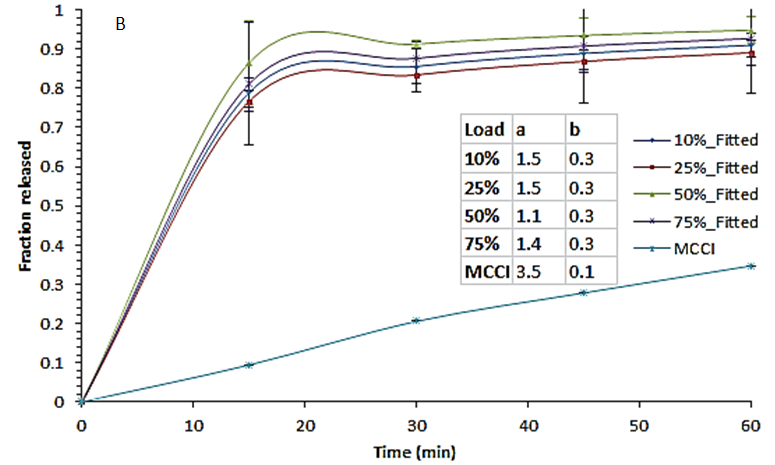 The drug release kinetics from the beadswas determined by in vitro experimental studies. As clearly appreciable, the high aqueous solubility of VH(83 mg/ml) favored the rapid release behaviour from the pellets as compared to that from CBZ beads.For this reason, the initial segment of the VH curves is steeper. Further, VH samples were able to release at least 80% of the drug within 10 min regardless of the drug loading (fig. 2). Thus, VH exhibited a fast diffusion and release from the pellets. Moreover, MCCII pellets released at least 60% of CBZ within 15 min. Therefore, the drug release profileswere highly dependent on the solubility of the drugs and the high affinity of MCCII for water molecules. For instance, VH was washed out from the pellets leaving the pores in the matrix by diffusion; concomitantly MCCII pellets drew water molecules into the particles causing a burst by capillary action. In this case, MCCII acted as an insoluble matrix in which the eluting aqueous media penetrated the matrix causing drug diffusioninto the surrounding environment for ultimate absorption. Further, no significant differences were observed among the release profiles of VH from MCCI and MCCII.Conversely, the CBZ release rates from MCCI pellets markedly diverged from those of MCCII pellets. In fact, the “b” and “a” values of MCCI were the smallest and the highest, respectively indicating a very low release rate. This is explained by the lower capability of MCCI for water wicking, which caused a slowing pellet disintegration and hence, a sluggish drug dissolution.Further, the extent of release as reflected by the area under the curve of the release profiles revealed no significant differences among the VH (24-25 min) pellets, whereas for CBZ samples MCCII pellets showed higher values (42.4-47.3 min) as compared to the MCCI pellets (11.3 min).