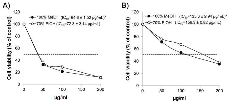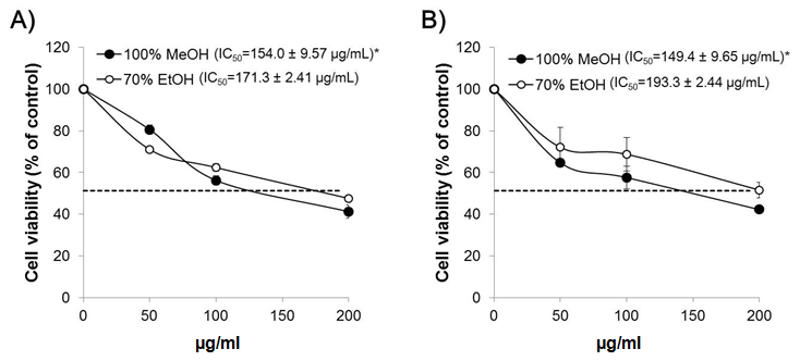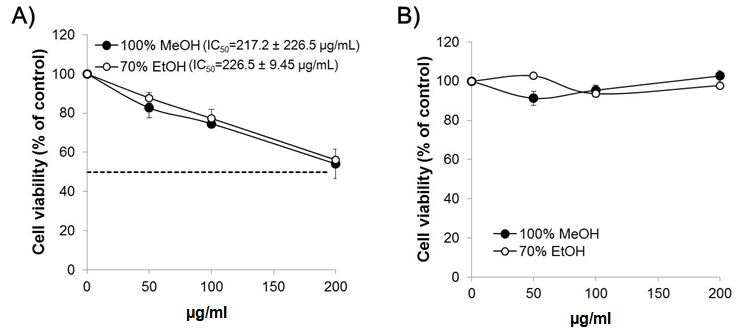 Data were analyzed using SPSS statistical software (SPSS, ver. 12.0; SPSS Inc., Chicago, IL, US). Comparisons of all results between methanol and ethanol extracts of Camellia mistletoe were made by using a non-parametric test (Mann-Whitney U test) with p<0.05.
