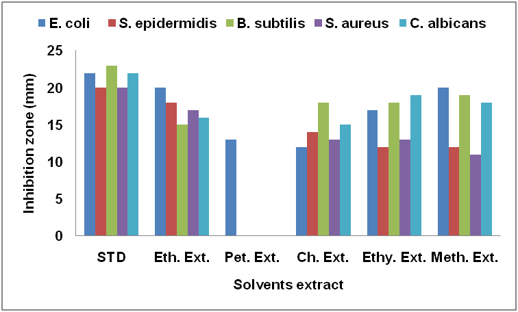 The antimicrobial activity of T. occidentalis seeds extracts, against standard microorganisms (fig. 1) was found to be highest against E. coli followed by B. subtilis, C. albicana, S. aureus and S. epidermidis. The highest activity was shown by an alcoholic (ethanol, methanol) followed by the ethyl acetate, whereas, the moderate activity showed by the chloroform extract. The petroleum ether had the least activity, only E. coli was found to be sensitive with low inhibition zone.