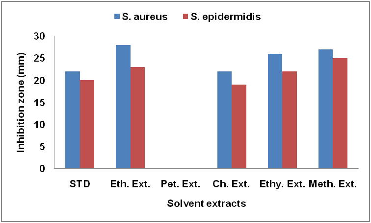 Regarding the activity against the isolated S. aureus and S. epidermidis bacteria (fig. 2), the two bacteria were highly sensitive to the ethanol, methanol and ethyl acetate extracts, and their activity was found to be higher than that of standard Streptomycin. The chloroform extract showed moderate antibacterial activity against the isolated bacteria. The two bacteria were resistant or insensitive towards the petroleum ether extract.