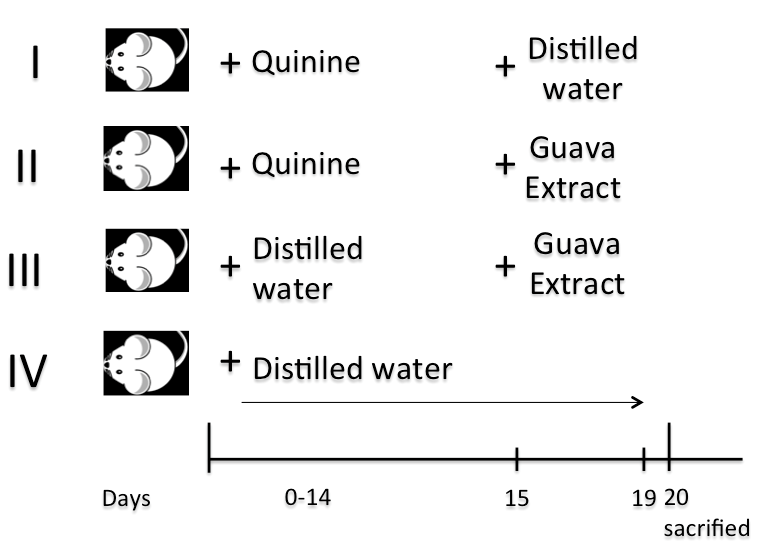 The mice (n=20) were divided into four groups of five. The first group received 2.8 mg/20g body weight of quinine orally for 14 d and 1 ml of distilled water orally for 5 d. The second group received 2.8 mg/20 g body weight of quinine orally for 14 d and 0.785 mg/20g body weight of guava extract orally for 5 d. Group three received 1 ml distilled water orally for 14 d and 0.785 mg/20g body weight of P. guajava L. extract orally for 5 d. Lastly, group four received 1 ml distilled water orally for 19 d (fig. 1).