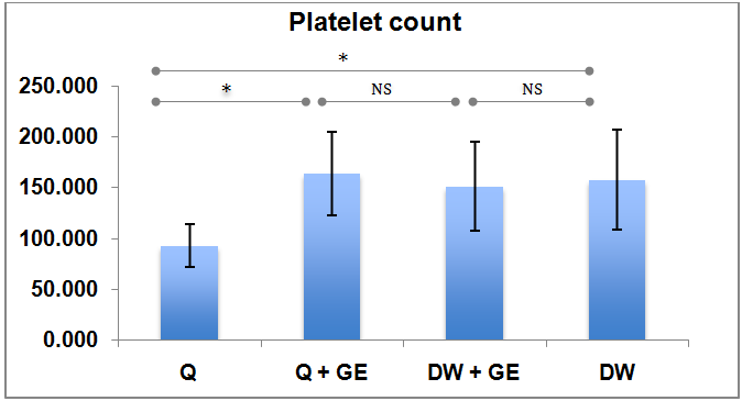 Fig. 2: Guava extract increase platelet count, mice bloods were collected by cardiac puncture, analysis using independent t-test found that guava extract significantly increase platelets count in mice were treated with quinine compared to control (p<0.05). Data were presented from 5 independent mice in each group. Q: quinine, GE: guava extract, DW: distilled water, *significancy P<0.05, NS: not significant