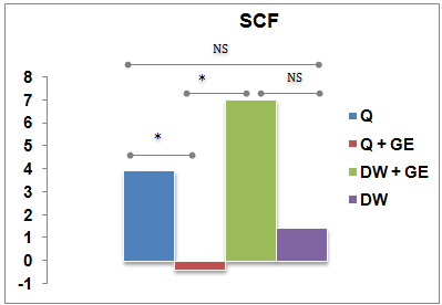 Q: quinine, GE: guava extract, DW: distilled water, *significancy P<0.05, NS: not significant