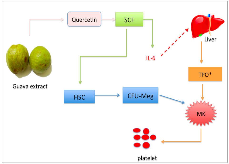 Fig. 5: Proposed mechanism of platelet production by guava extract, administration of guava extract rich in quercetin increase level of SCF mRNA which can stimulate IL-6 to induce TPO secretion by liver resulting an increase the platelets number, *to be further confirm
