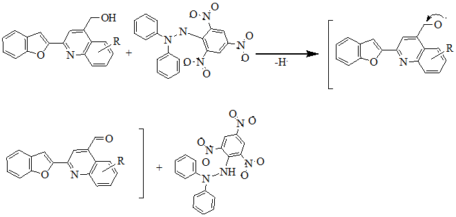 Free radicals are species capable of free existence that contains one or more unpaired electrons which react with another molecule by accepting or donating the electrons [1]. The harmful intervention of reactive oxygen species (ROS) in normal metabolic processes leads to pathologic changes which is a consequence of their interaction with biomolecules inside and outside the cells [2, 3]. ROS contain molecules like hydrogen peroxide (H2O2); hydroxyl radical (·OH) and superoxide (Oz-), by the generation of ROS, there is an alteration in the normal functioning of the cell and leads to pathophysiological changes. Free radicals are responsible for causing a wide number of health hazards such as cancer, ageing, heart diseases and gastric problems, etc. Oxygen free radicals disintegrate DNA and destroy cell membranes by enzymatic metabolic processes [4-6]. In nature’s collection of biologically active molecules, benzofuran derivatives constitute a major group [7-9]. Benzofuran ring systems bearing substitutions at the C-2 position are widely distributed in nature and have been reported to have antioxidant, antiviral, antifungal activities [10, 11], antimicrobial [12, 13], anti-inflammatory [14], antipsychotic [15], analgesic [16], antilipidemic [17] and CNS stimulant activities [18]. Investigation of benzofuran derivatives in search of new drugs or to increase the efficacy of the present drugs has been most frequent approach [19]. Similarly, furan and its analogues were found to be biologically useful. 2-(furan-2-yl) quinoline-4-carboxylic acid and its analogues were reported to have the inhibiting property of C. albicans prolyl-tRNA synthetase and showed potent in vitro antifungal activities against dermatophytes [20, 21], 2-(furan-2-yl)-4-(phenoxy) quinoline derivatives were screened for cytotoxicity and anti-inflammatory activities [22], 4-(phenylamino) furo-[2, 3-b] quinoline and 2-(furan-2-yl)-4-(phenylamino) quinoline derivatives for cytotoxicity evaluation and 1-{4-[(furo[2, 3-b] quinoline-4-yl) amino] phenyl} ethanone exhibited potent and broad spectrum of cytotoxicity [23, 24]. The quinoline ring system is an essential structural fragment of a large number of natural and synthesized compounds displaying interesting biological activities such as antimalarial, antibacterial, anti-asthmatic, antihypertensive, and anti-inflammatory [25-27]. Quinolines and their derivatives have been found applications as pharmaceuticals and agrochemicals, as well as being general synthetic building blocks [28-31]. Molecular hybridization is a rational approach to design new prototypes after coupling different pharmacophoric subunits that can be recognized by two or more biologic receptors [32]. These strategies have been used in drug discovery to increase the efficacy.