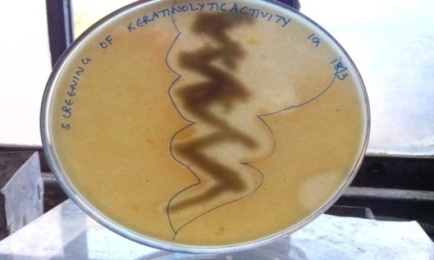 The isolates TMS1a exhibited keratinolytic activity by hydrolyzing keratin on keratin agar plates. A Clear zone of hydrolysis was observed around the growth TMS1a isolate as shown in the fig. 2.
