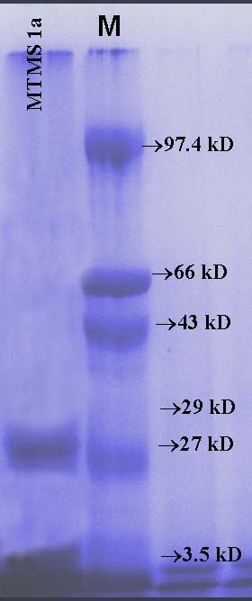 Fig. 3: Sodium dodecyl sulphate–polyacrylamide gel electrophoresis (SDS-PAGE) image of purified enzyme from the isolate TMS 1a, M indicates: Standard protein marker 3.5, 27, 29, 43, 66, 97.4 kDa