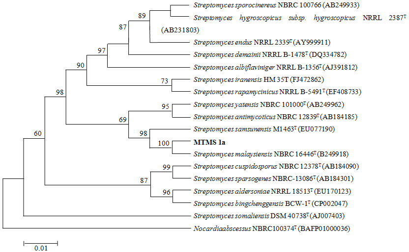 Molecular identification and characterization of the isolate TMS1a was carried out by 16S rRNA gene sequencing analysis of Streptomyces taxonomy to investigate the relationships at genus, species and strain level. This was performed at Institute of Microbial Technology (IMTECH), Chandigarh. Evolutionary history and evolutionary distances were inferred by using Neighbor-Joining method (Saitou and Nei, 1987) and Kimura 2-parameter method (Kimura, 1980) [18, 19].