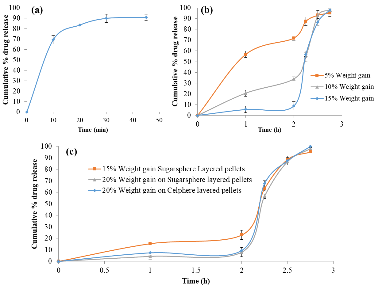 This could be due to higher surface area of sugar sphere pellet than pellets prepared by extrusion and spheronization. Hence additional 5% weight gain (total 20%) in coating was done to achieve desired release profile in sugar sphere pellets. Similarly, celphere layered pellets showed the desired release profile at 20% weight gain.