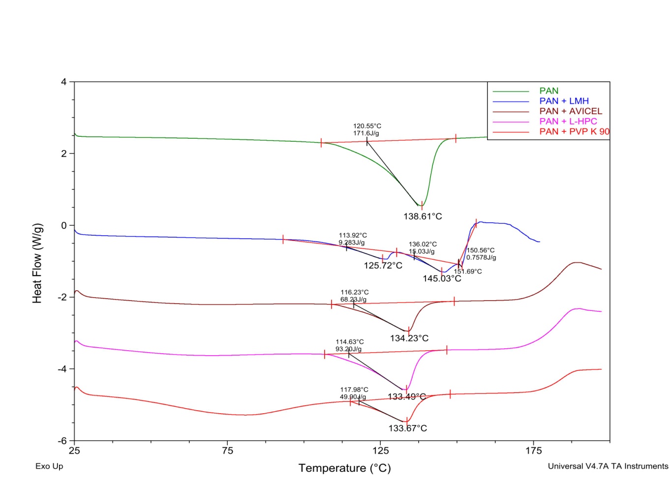 Differential scanning calorimetry is one of most useful technique reported for drug-excipient compatibility study for various formulations, either it is solid dosage form or semi-solid dosage form filled in capsule [19-21]. For the present study, drug-excipient compatibility was evaluated by differential scanning calorimetry (DSC) [22]. The physical mixtures of Pantoprazole with lactose monohydrate, Avicel® PH 101, Kollidone® K 90 and L-HPC LH 32 in the proportion of 1:1 were prepared by triturating in a dry mortar for 2 min. The samples were heated in the sealed aluminium pan under nitrogen flow (50 ml/min) at scanning rate 10 °C/min from 10 °C to 270 °C. An empty aluminium pan was used as a reference.