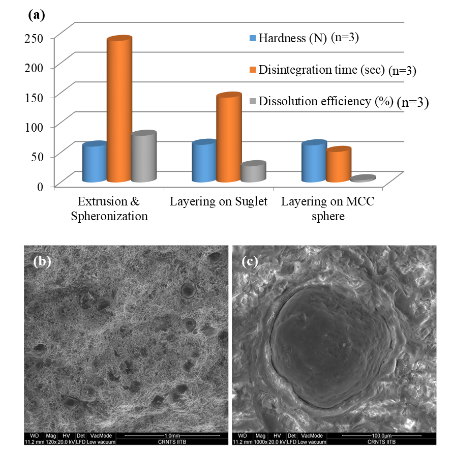 Fig. 3: (a) Characterization of MUPS prepared by different types of Pantoprazole (DR) pellets (n=3) (data in this fig. is presented as mean) (b) Scanning Electron Microscopy (SEM) of MUPS tablet and (c) SEM image of pellet prepared using Pantoprazole delayed release pellets