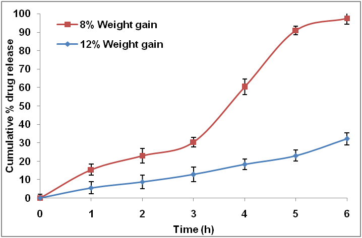 fig. 4 shows the effect of weight gain of Eudragit NE 30 D coat on pantoprazole pellets to delay the drug release in acid media. Eudragit NE 30 D was loaded on pantoprazole pellets at 8% and 12% weight gain. Dissolution was continued for 6 h in 0.1 N HCl. It was observed that pellets with 12% weight gain could delay the release effectively than the pellets with8% weight gain.