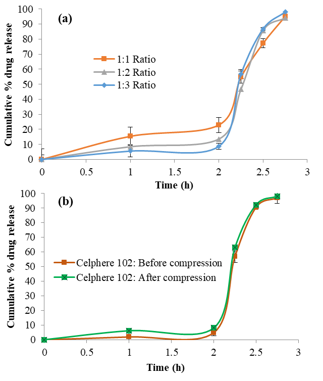 As concluded from table 4, a mixture of ceolus granules and ludipress was used as tableting excipients for pellet compression. Ludipress has several advantages such as the low degree of hygroscopicity, good flowability, tablet hardness independent of machine speed [32]. The ratio of drug loaded pellets to tableting excipients was an important parameter optimized to compress the pellets into tablet form [33]. fig. 5(a) suggested that 1:3 ratio of drug loaded pellets to tableting excipients was optimum for pellet compression. fig. 5 (b) shows dissolution profile of pantoprazole MUPS, prepared from Celphere 102 compressed with Ludipress and Ceolus granules.